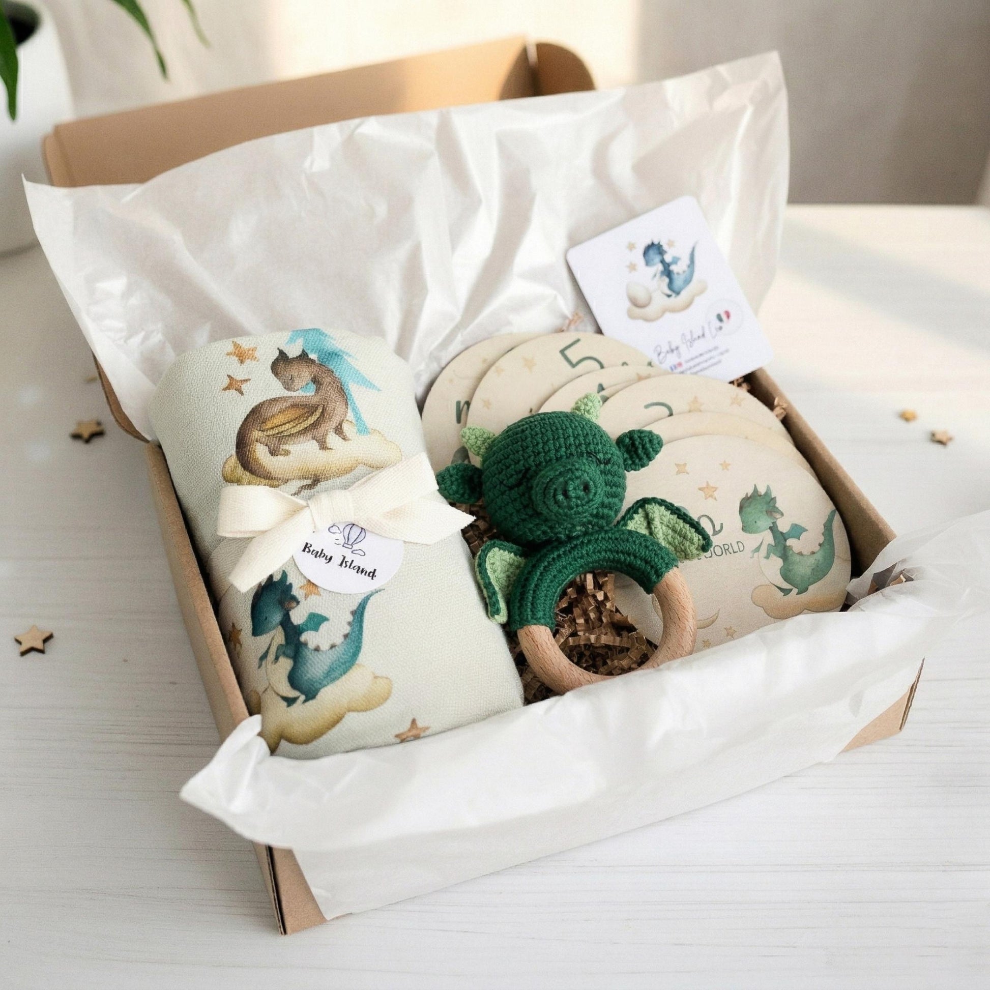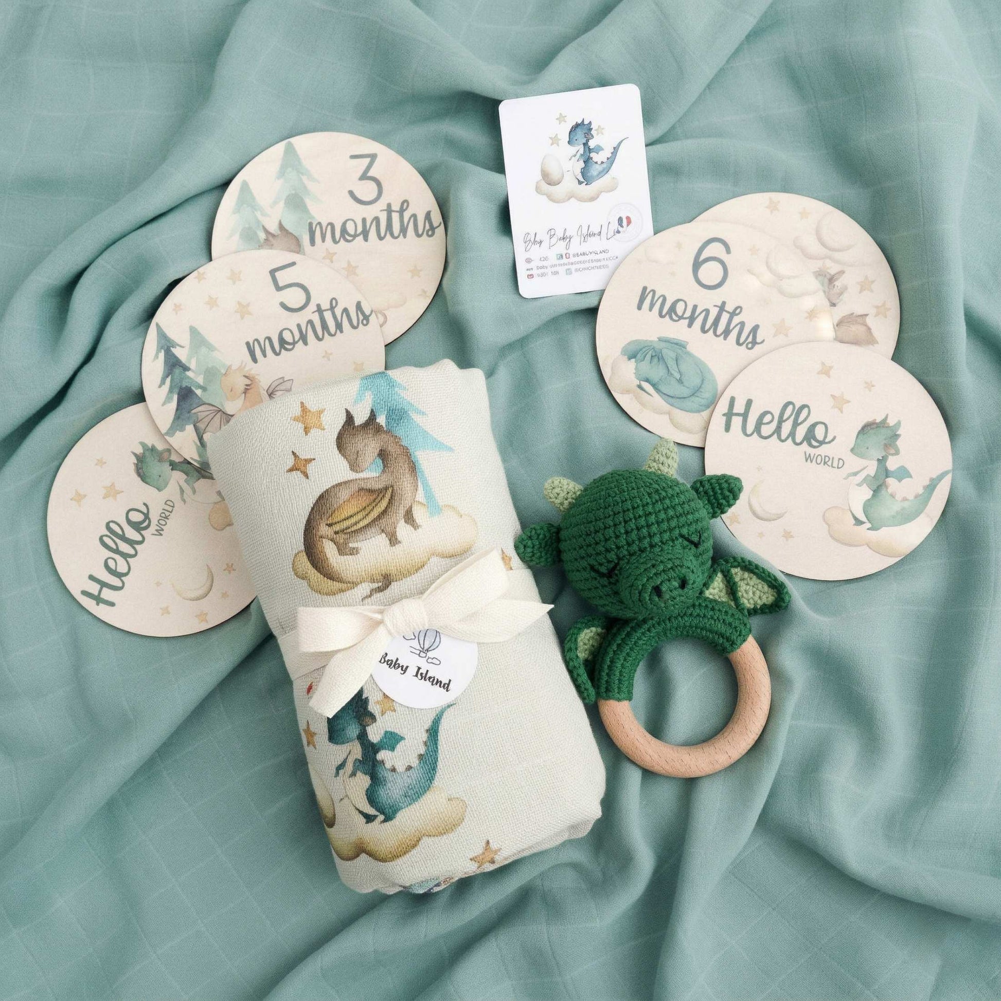 - 7 card complimese in legno con "hello world" e mesi da 1 a 12 con adorabili draghetti in coordinato con la mussola